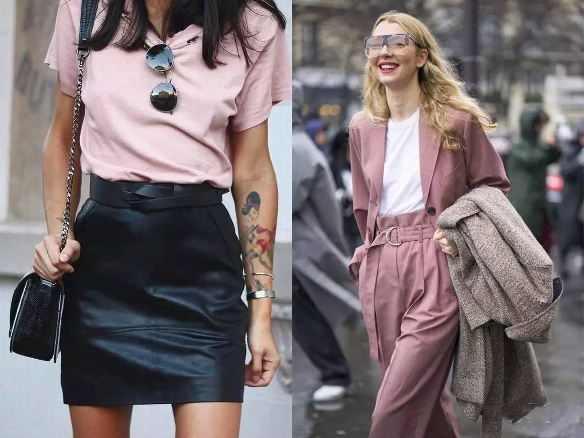 或者是选择搭配硬朗的风格,一条皮裙或是烟粉色的西装套装。用风格压制就能很好的平衡粉色的甜腻感 :