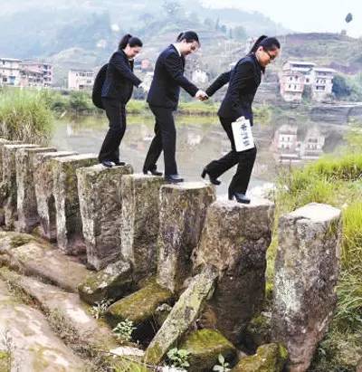重庆忠县黄金镇女子法庭干警,迈上跳磴桥进村办案。