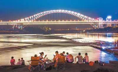 重庆市民在朝天门长江大桥边避暑纳凉。