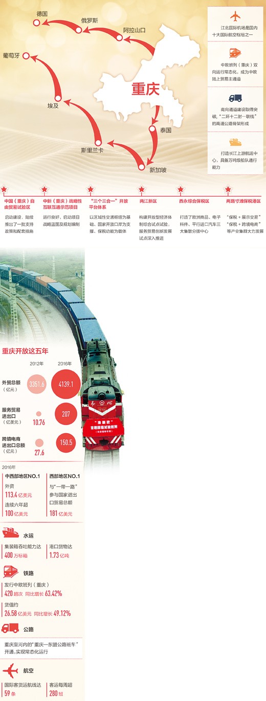 中欧班列(重庆)的开通和常态化运营,离不开体制机制的创新:“五国六方”铁路联席会议制度确立,实现班列定站点、定线路、定车次、定时间、定价格;中欧安全智能贸易航线试点计划和多国海关“一卡通”制启动,货物一次报关、一次查验、全程放行;货量和价格挂钩,价格优势明显并逐年下降……目前,中欧班列(重庆)已在中欧班列中占据主导地位,成为“一带一路”上的重要通道。