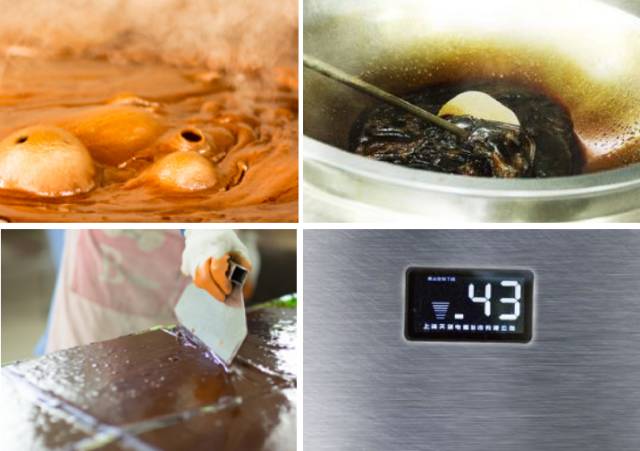 用18口数码温控连环锅,完后榨汁,开泡,赶水、过滤、摇瓢,成型等过程,历经“五榨三滤两浮一沉”,约10-12个小时后,即可将红糖舀入模子,冷却成型。