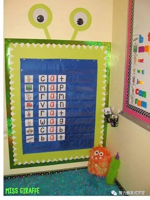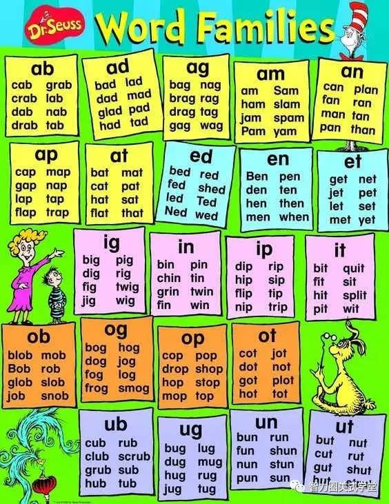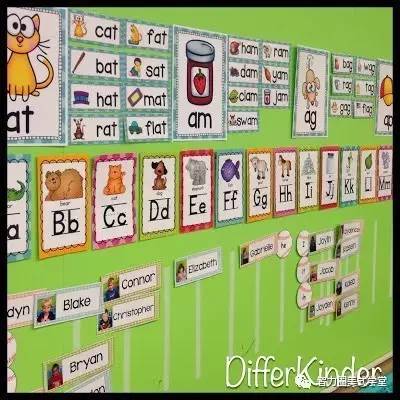还可以按照文字家族(Word family)的方式来设置文字墙。什么是文字家族?文字家族就是一组有相同的模式、词缀、发音的词的组合。例如at, cat, hat 和fat 都是”at”音的文字家族。