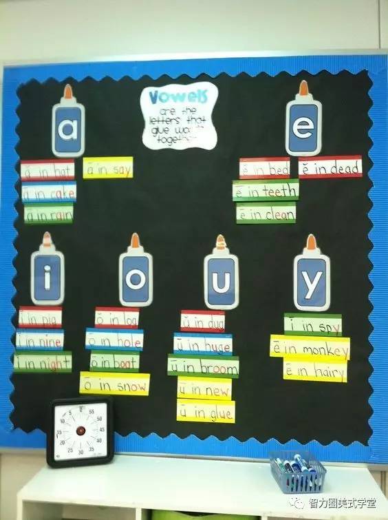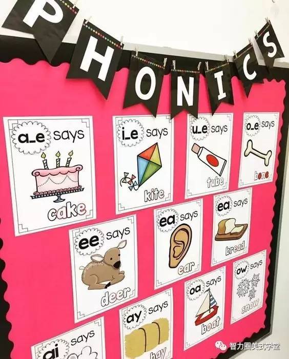 有一些自然拼读的一些常见的拼法也可以制作成文字墙。例如用大图来展示某些经典组合的拼法,等孩子熟记以后,就能根据掌握的规律来拼读其他词汇。例如a_e的组合,可以根据蛋糕(cake)的发音来熟记。