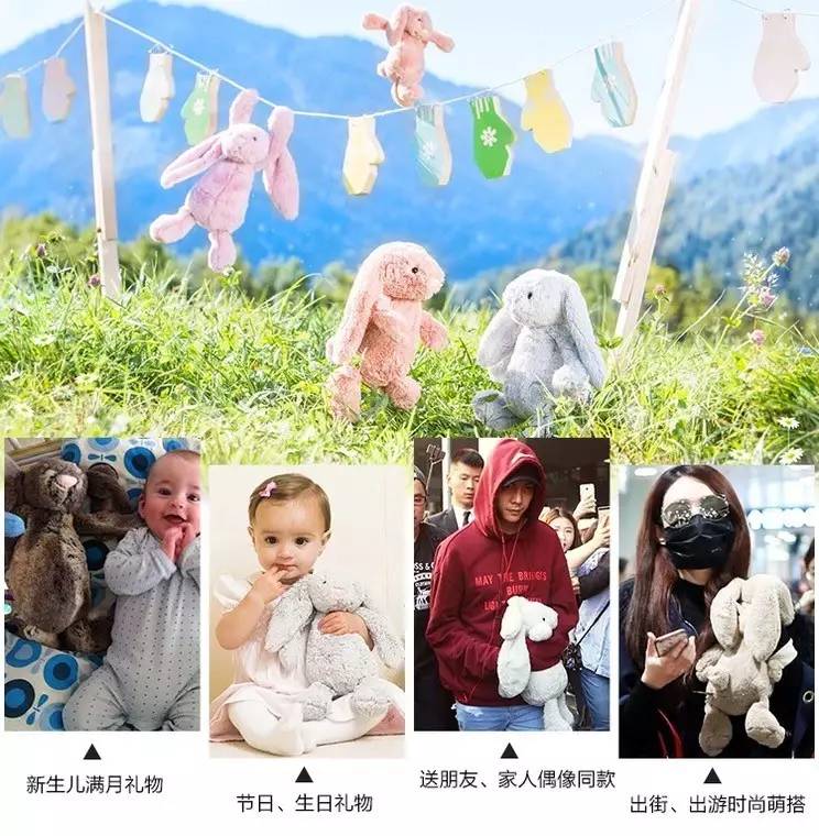 Jelleycat邦尼兔必须是全世界大小朋友都爱的毛绒玩具,好多明星宝宝都爱,阿汤哥的女儿小苏瑞,她的街拍中出镜率最高的毛绒玩具就是这只兔子,真的是小苏瑞抱火了这只兔子。