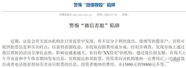 证监会在去年11月发布的风险警告,就揭露了这种骗局,警惕“微信荐股”陷阱。
