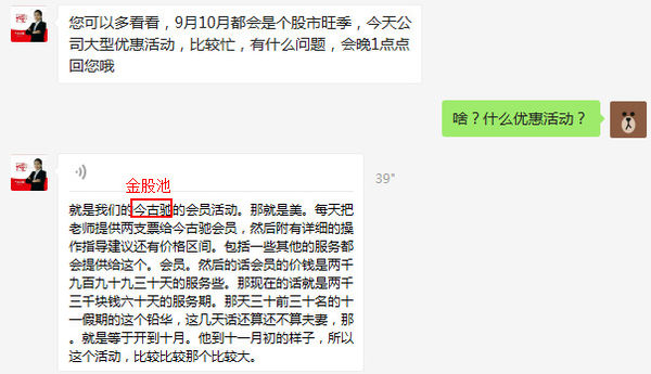 说时迟,那时快。小助手已经给我开始推销金股池了!到说价格的时候,嗷的一下切换到了打字:原价2999元一个月,现在3000元两个多月,四舍五入就是一个亿。