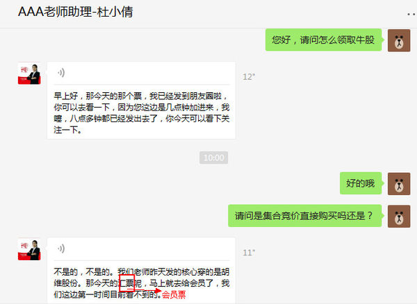 我找到她之前推的一个会员票,当天下午发的朋友圈:牛票,一推荐怒涨三个点!