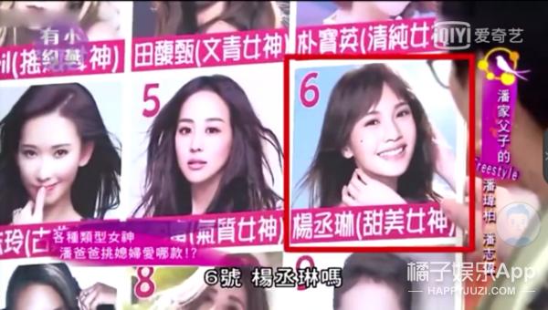 在节目的现场,小燕姐还准备了各种类型的女神,让潘爸爸挑选。到底哪一个才是潘爸爸心中的“潘家媳妇”呢?潘爸爸的最终选择是6号杨丞琳↓