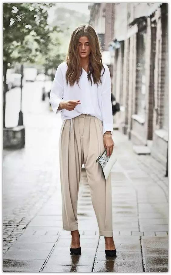 再肥大一些的有点接近哈伦裤,遮盖效果以及平衡上半身的效果会更好,但越肥大的越适合个高的人穿,因为裆的位置也会变低,重心下移,会显矮。大家根据自己的情况来选择吧