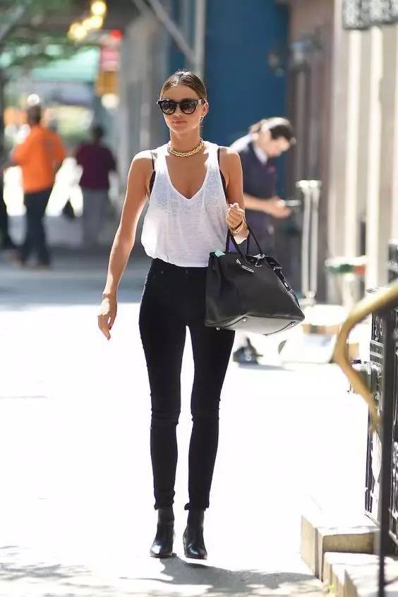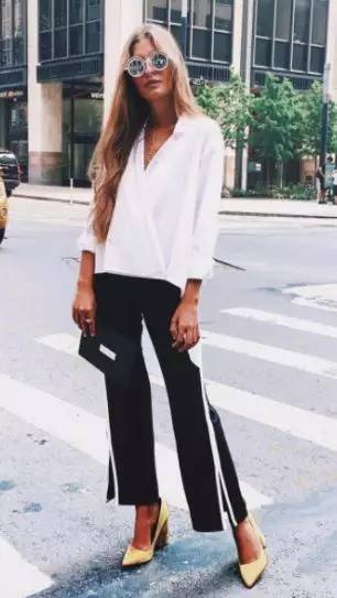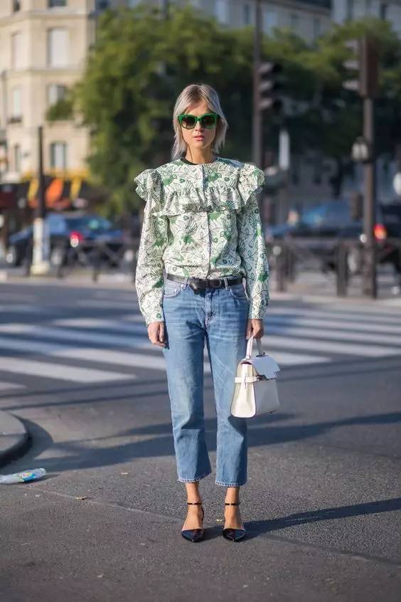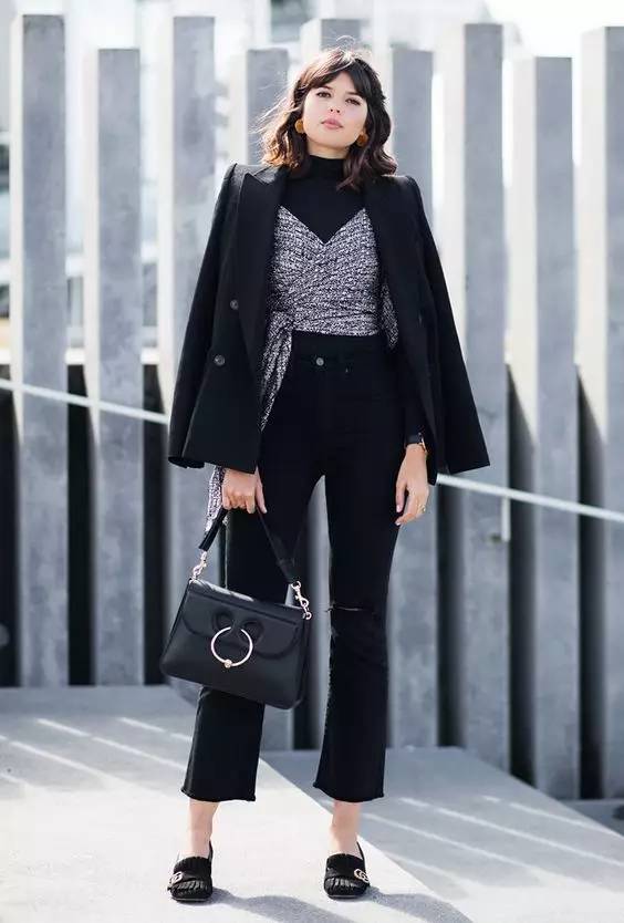 另外还有九分喇叭裤也非常流行,这种更为实穿,同时也把重心和视线转移到了裤脚,也能起到平衡梨形身材比例的作用