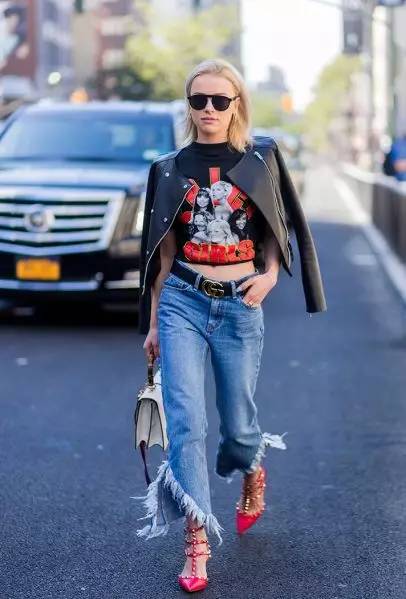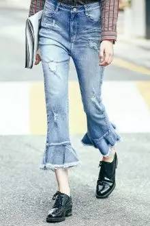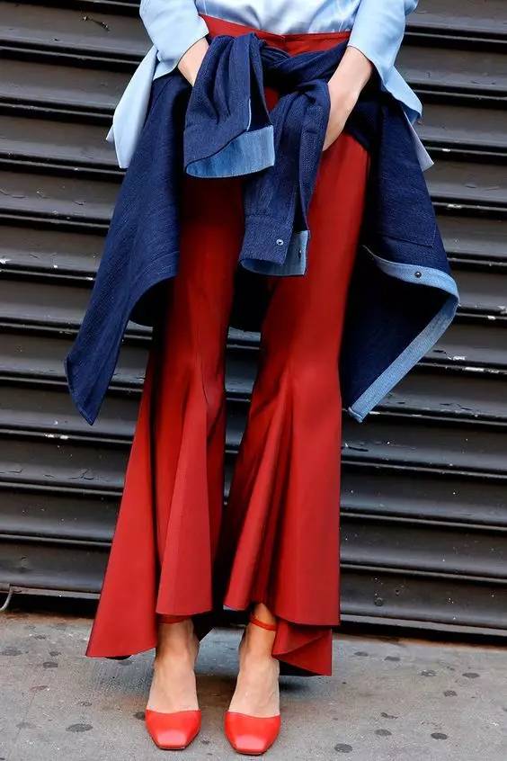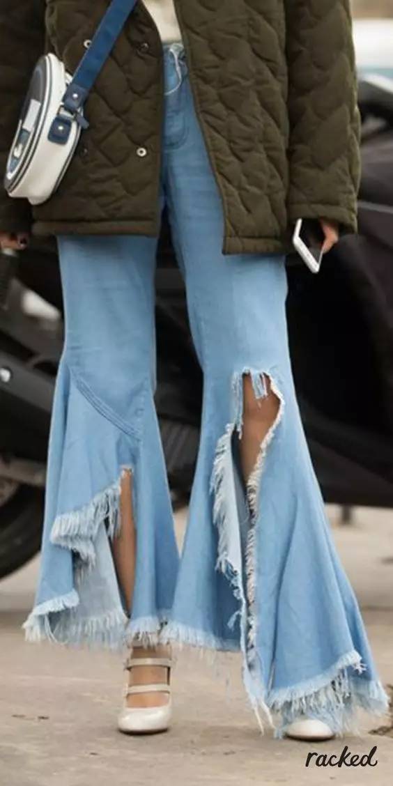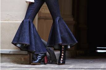 今年的喇叭裤喜欢在裤脚长做文章,变化出更多有设计感的夸张喇叭裤。在复古的款式上融入新时尚。