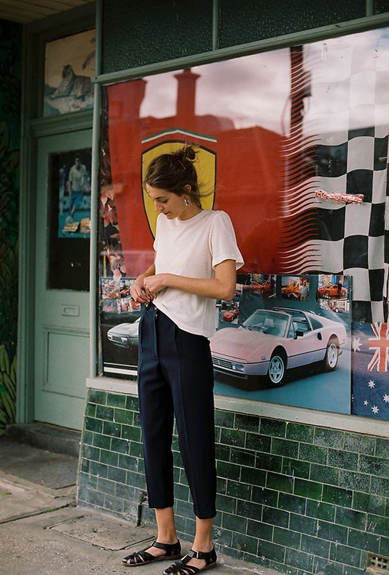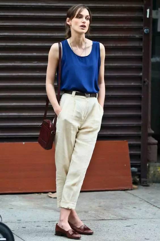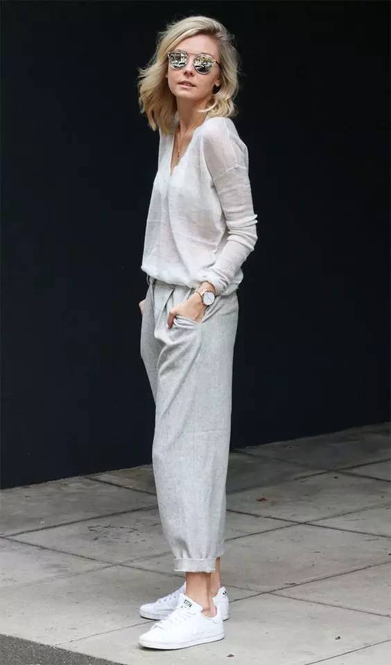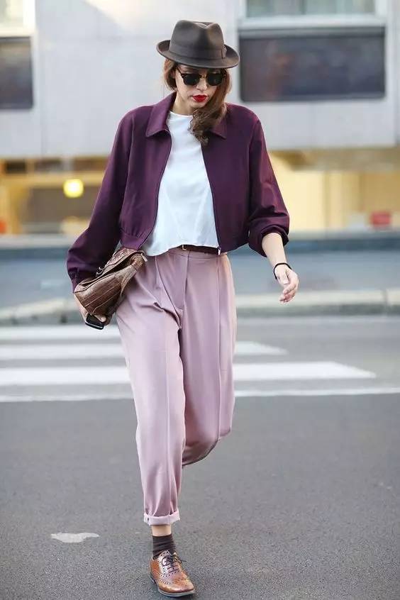 略宽松的锥形裤可以穿出帅气的气质。锥形裤通常会做成九分裤,能够露出纤细的脚踝。裤脚的宽度也于略大于鞋口,这样的裤型对小腿的高求比较高,如果你的小腿略粗,不要选择小腿紧绷的款式,稍微宽一点的锥形裤会更适合。