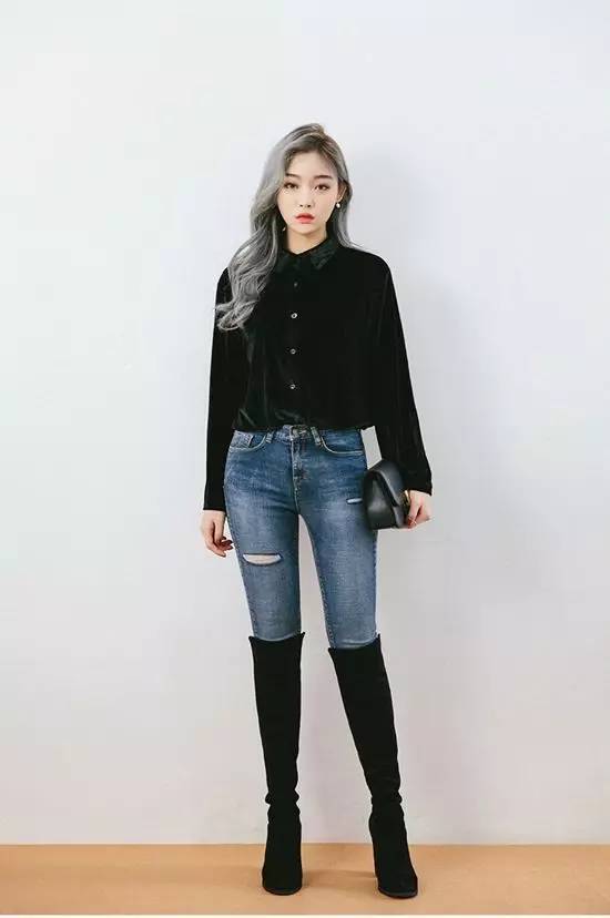 梨形身材妹纸如果担心臀部和大腿的粗的问题,只要差中长款的上衣略微遮盖一下就可以了,比如说半塞衣角、前短后长。秋天有外套的话则更加方便,内搭塞进裤子里显出比例,外套遮盖大腿两侧