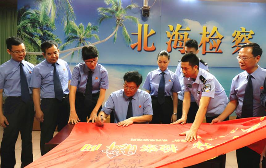 北海市检察院检察长王大春在“一带一路 检察瞬间”旗帜上签字。黄伟 摄