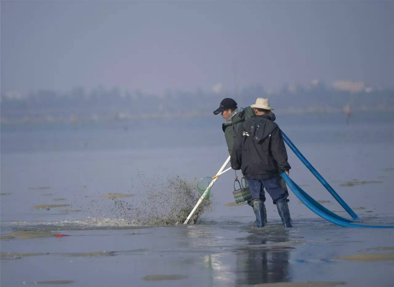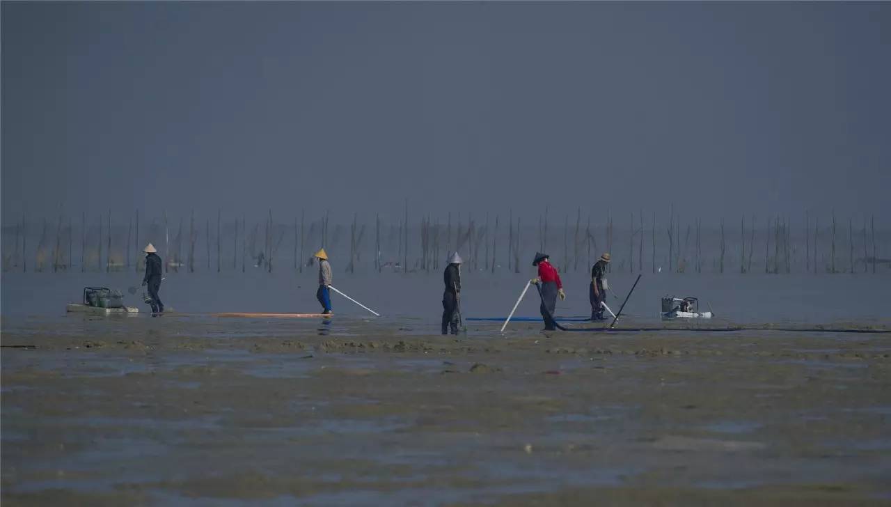 摄影爱好者拍到的一幕:有人搭载高压水枪在金海湾滩涂处捕捞沙虫,海滩泥桨飞扬。
