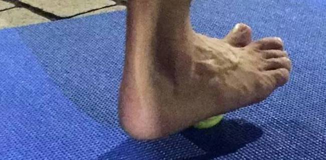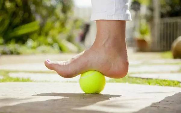 步骤2:将球放至内侧足弓的位置,加入身体重量按压,搭配10次呼吸,做脚趾头抓放的动作。