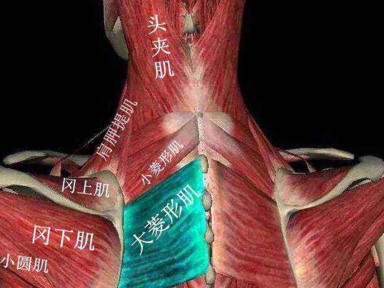 步骤1:找到肩胛骨内缘前,首先找到菱形肌的位置这块肌肉。菱形肌又可分为大菱形肌与小菱形肌,小菱形肌分布位置较为靠上, 大菱形肌分布位置在下。