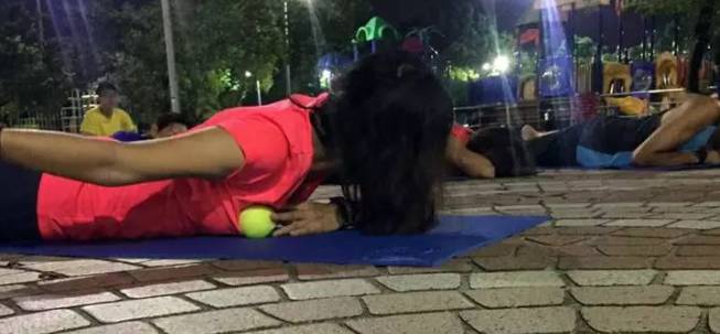 步骤2:俯卧,定点按压,配合10次呼吸,想象呼吸时要将球顶出去的感觉。
