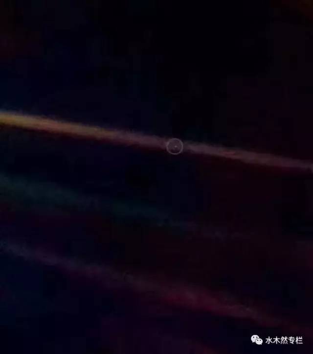 这是1990年旅行者1号探测器即将飞出太阳系的时候,在距离地球60亿公里的地方,美国国家航空航天局命令它回头再看一眼,拍摄了60张照片。其中一张上正好包括了地球——上图中那个亮点。