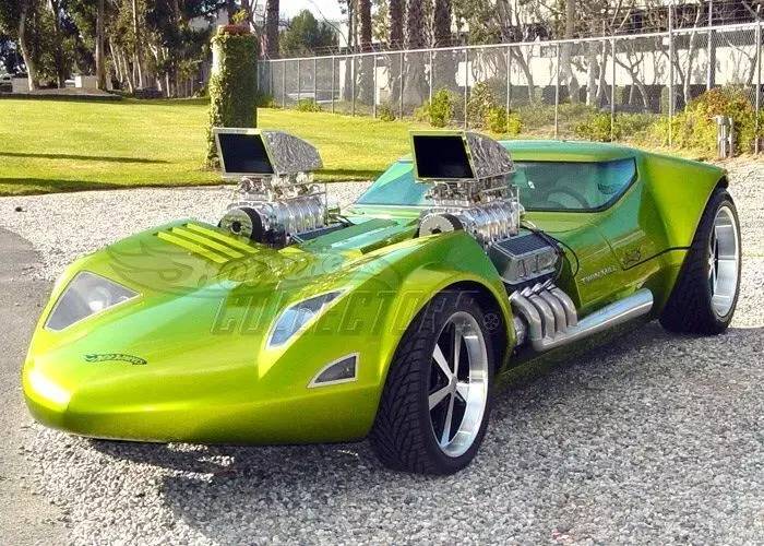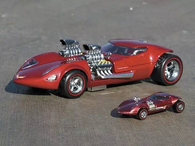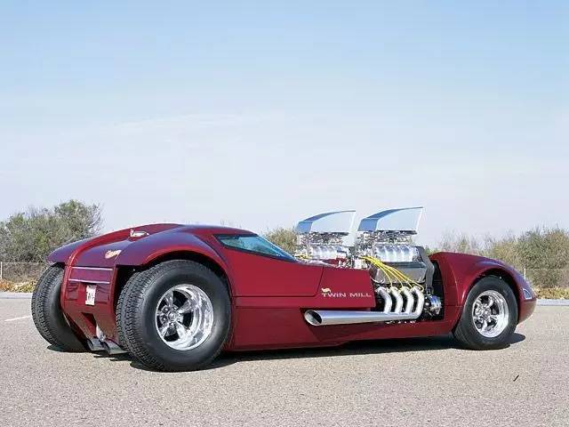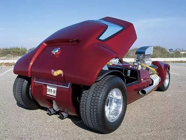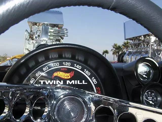 Hot Wheels风火轮是美国玩具制造商美泰旗下的知名小比例合金玩具车系列,这点相信许多车友都再清楚不过了。这里要提到的是一部复刻作品——1969年风火轮推出的1:64模型当中有一款叫做Twin Mill的原创车型。1998年,美泰的一位执行董事在风火轮系列诞生三十周年提出复刻真车比例的twin mill的计划。起初项目被委托给Hot Rod by Boyd的老板Boyd Coddington,并由Chip Foose负责制造。不凑巧的是,Hot Rod by Boyd那年倒闭了,计划就此搁浅。后来风火轮主管Carson Lev重启项目并与Barry Lobeck签订合同。成品在2001年拉斯维加斯的SEMA改装车展上首发,然当,这台车是完全可以运转的,比如拥有头灯、转向灯、仪表,以及两台总功率可以输出1400马力的502立方英寸(约8.2升)发动机。而这辆车的颜色也经过数次改变,从最初的红色改为绿色,再后来又改为蓝色。