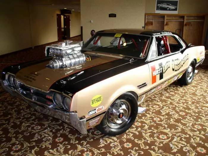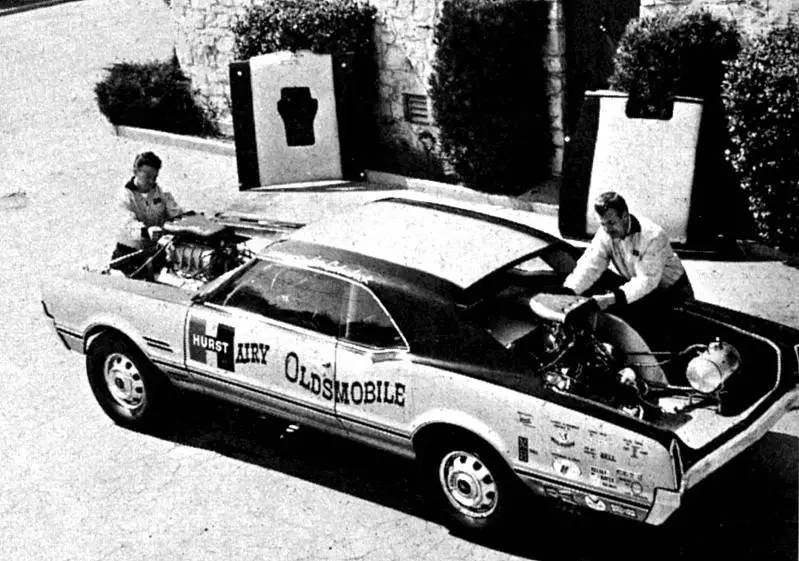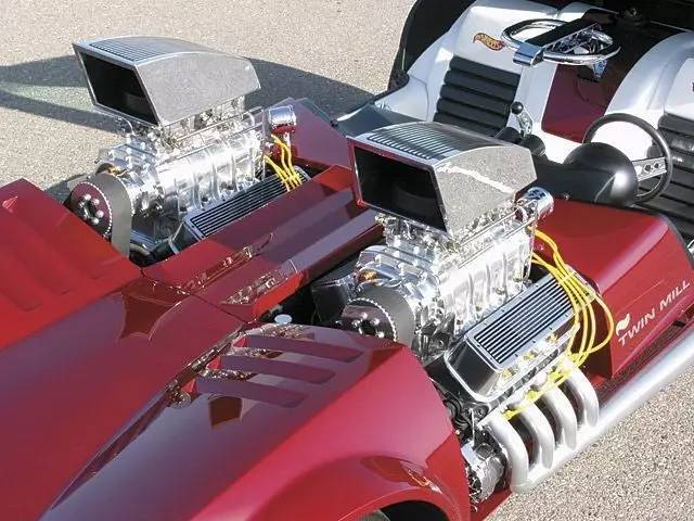 大部分双引擎车型的制造初衷都是为了让引擎可以同步工作,而驾驶员只需要负责一整套系统的控制---但是1966年款Hurst Hairy Oldsmobile是个例外。这台搞笑的奥兹莫比尔直线加速赛车安有两台425立方英寸(约7.0升)的V8发动机----一台前置一台后置----以及和它们协同配合的其他机械装置。具体来说,Hariy Olds专属制品包括两套转速表、两根换挡杆甚至两个油门踏板,以证明两根独立的链条驱动传动轴的实力——当这部2000多马力的机器在11秒内完成0-400米加速时四个车轮都会冒出滚滚浓烟。