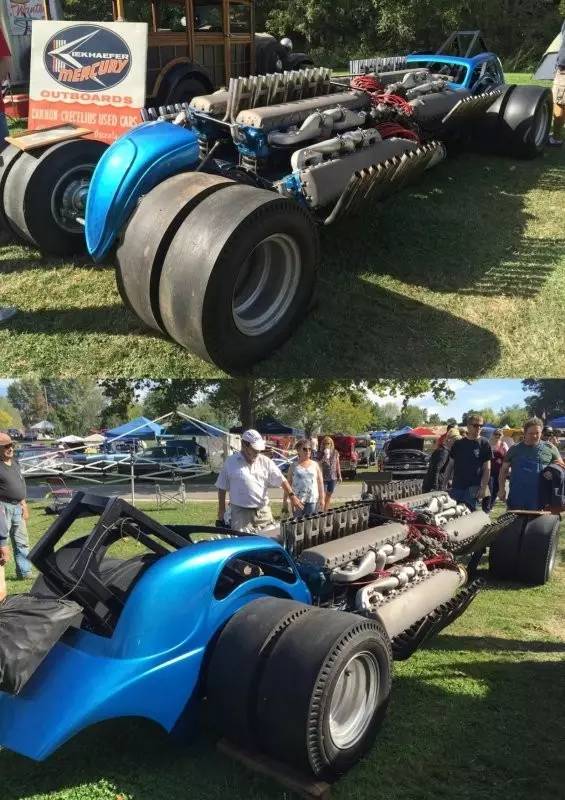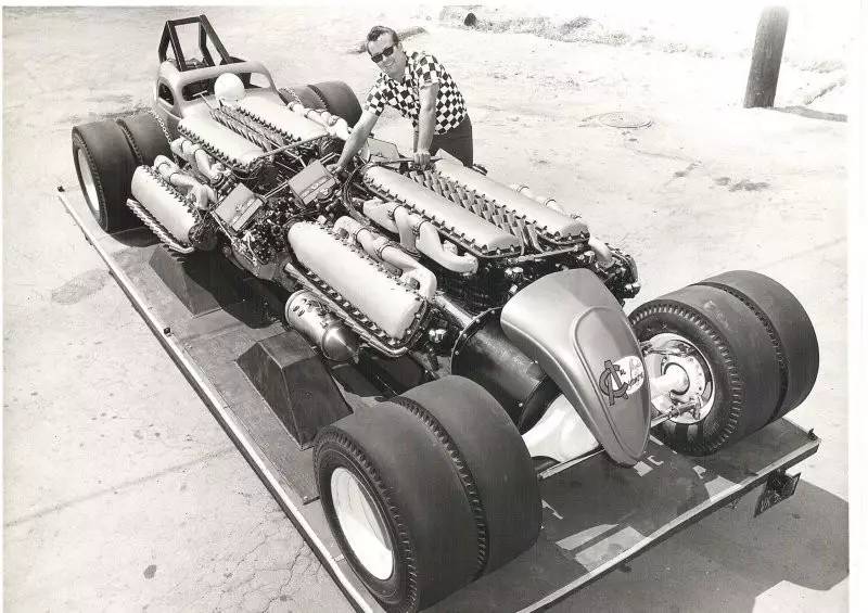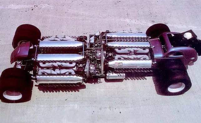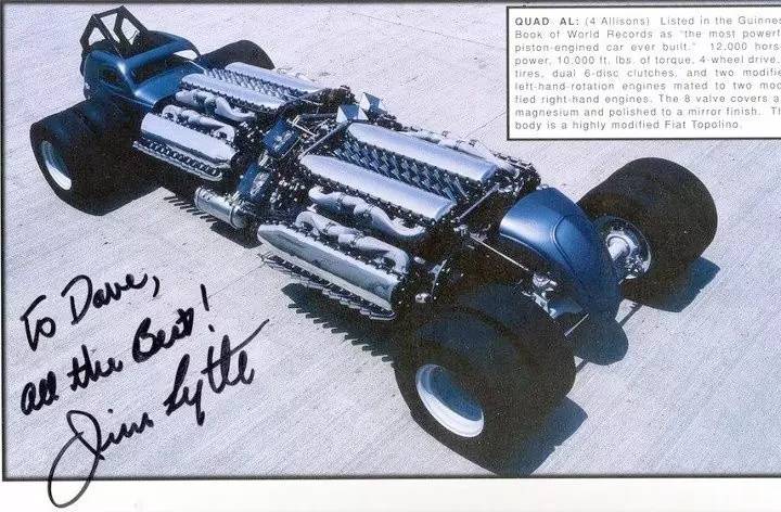 20世纪60年代时,当疯狂的美国人需要把轻量化车身大卸八块然后改造成直线加速赛车时,福特Anglia和菲亚特Topolino(意大利语的“米老鼠”,其实就是1936到1955年产的菲亚特500)这类紧凑进口车是再好不过的选择(Angelia是英国福特针对英国市场开发的车型,所以说进口也没啥不对)。动力方面的话,Allison V12航空发动机架在顶上就行了。于是乎,Jim Lytle捣鼓出了一台绰号为Big AI的1934 Ford dragster。可能是他觉得两台还不够,于是又追加了两台Allison航空引擎,以及部分Topolino的车身结构,就变成了这部“Quad AI”原型车。不幸的是,在他能够打造出一具可以将这四台发动机耦合起来的变速箱之前,他花光了所有的资金。而让制造者得到安慰的是,这辆车仍然作为“世界上功率最大的活塞引擎汽车”被载入了1973年的吉尼斯世界纪录。