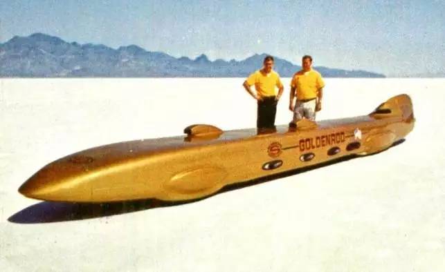 1965年到1991年间,车轮驱动的车辆陆地极速记录属于来自加州的Summers兄弟和他们的Golden Rod赛车。俗话说得好,要想动力强,排量就得大(by 广大hot rod爱好者),所以这俩兄弟认为,要达到极速超过400mph(约640kph)目标的最简单方式是把四台Hemi V8引擎用并排布局串联,并将它们的2400马力传递到轮胎就好了。结果很美好——1965年11月,他们完成了一次极速409mph(658kph)的测试并创造了一项保持25年的纪录。而Hod Rod(为了直线加速赛而改装的大马力大引擎美国肌肉车)界的传奇人物Mickey Thompson,当时用的也是一台类似的名为挑战者1号的四引擎LSR赛车。