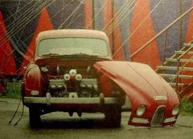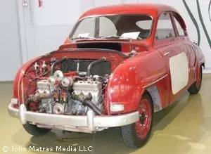 萨博是一家科技树经常点歪的车企(也就他们能想出来用飞机操纵杆代替汽车方向盘的点子,战斗机造得太好也不能这样玩吧),因此对于他们来说弄出来下面这样的杰作也就不足为奇了。萨博当时需要从两冲程引擎压榨出更多动力以便能够在赛场获胜,于是就研发了这台红色的1959年款萨博93实验车。