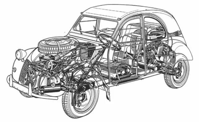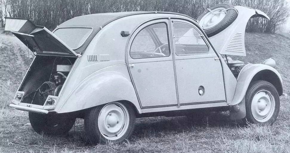车迷都知道,2CV不是为速度而生的:在上世纪50年代,它的425cc引擎只能输出12马力左右的动力,这数据和北美常见的可乘式割草机差不多。1958年,雪铁龙推出了限量694台的双发动机四驱2CV“撒哈拉”,第二胎引擎藏在后尾箱盖下方。这台为了穿越北非而打造的车型,在一台引擎介入下极速可以达到65千米/小时,而双引擎介入下极速则可以达到105千米/小时。