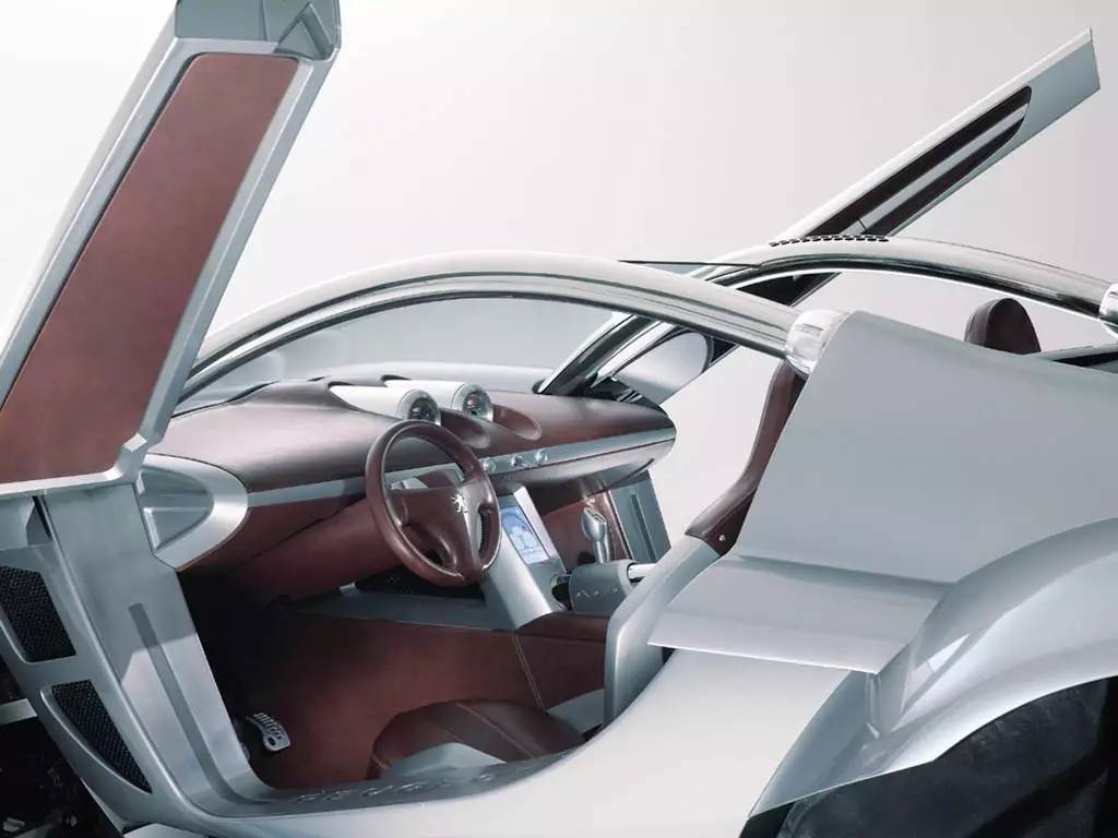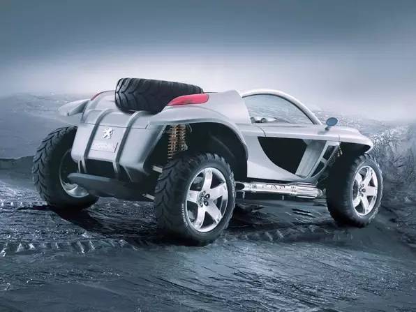 这是一台第一眼就能让人感受到前卫感的概念车。虽说大体造型和双座沙滩车类似,不过呢,它的机械构造不知道比普通的沙滩车高到哪里去了。车体为碳纤维蜂窝单体壳结构,同时采用两根直径76毫米的不锈钢防滚架进行强化。而这些钢管同样也起到了引擎进气通道的作用。动力方面,标致采用了两台输出功率为133kw的2168cc涡轮增压柴油四缸HDi发动机,综合输出接近360马力,扭矩也达到了让人咂舌的800牛.米。为了给前后轴的动力单元提供支撑,标致也特地设计了两组管状副车架,而这些管状框架同样适合包括双叉臂在内的所有悬挂类型。