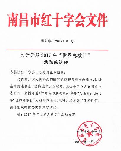 2017年9月9日,是第十八个世界急救日,南昌首届纪念世界急救日“爱心跳、救不停”急救大赛,将在八一公园火热举行。本活动由南昌市红十字会主办,南昌生命援手公益服务中心承办,现向全市紧急招募300名"急救侠",参加胸外按压接力大赛。