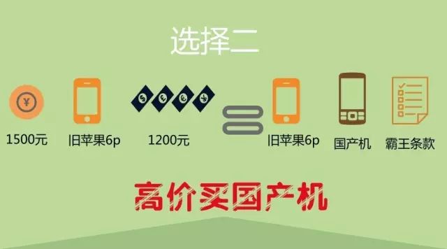选择2:1500元+旧苹果6p+1200元=旧苹果6+国产手机+置换霸王协议