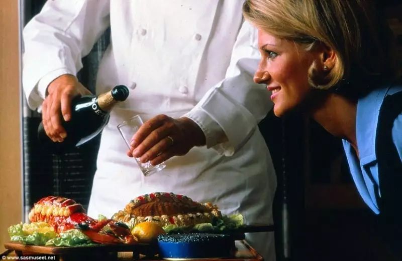 鱼子酱、一大盘龙虾、整条风干火腿推到客人面前切,这种在自助餐在地面的高级餐厅可以体验到,当年人们将其带到飞机上。