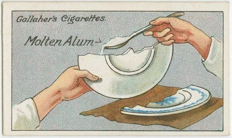 想要补好的瓷器经得起冷热水冲洗,可以在修补时使用明矾。把明矾放在旧的铁勺子里加热,直到明矾熔化,然后将熔化的明矾涂到瓷器的断面上,将瓷器补好;然后用绳子固定好,放置一段时间,让明矾充分作用,这样,瓷器就补好了。