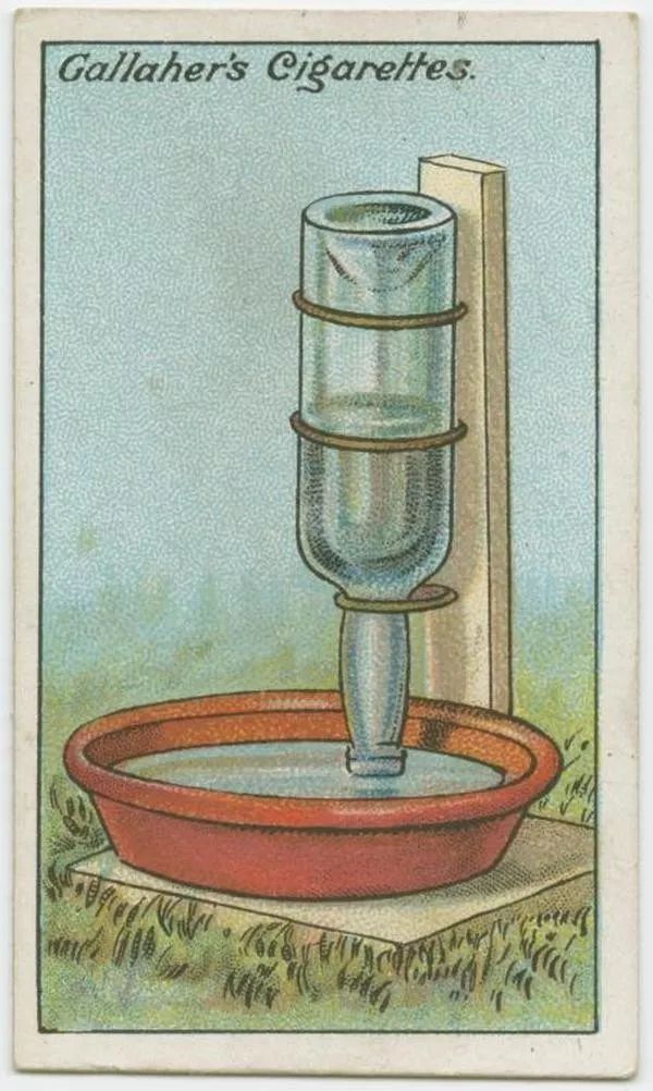 一个简单的喂水器能保证小鸡能喝到新鲜的水。把一个一品脱容量、装满水的瓶子用绳子垂直绑在木架子上,瓶口朝下。瓶口下方放一个陶制的盘子,瓶口距离盘底约半英尺的距离。