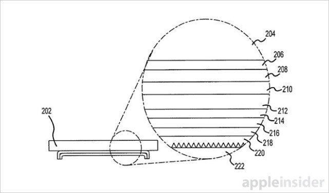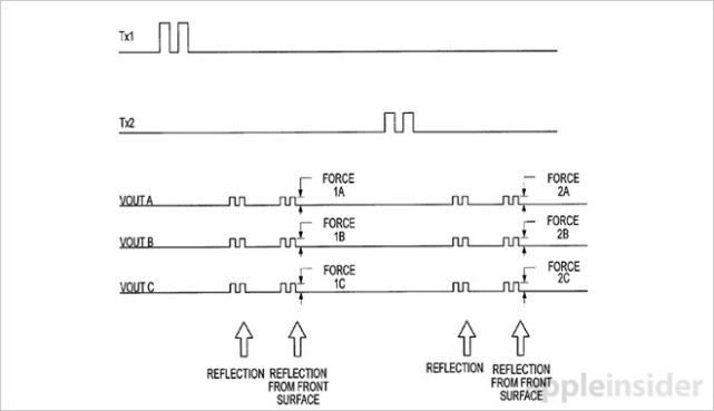 根据苹果的专利,这种压力传感器阵列可以与其他感应装置(比如电容触摸传感器)配合使用,后者可能也可以充当反射面。除了探测输入位置外,电容层还能用于检测多个同时进行的按压操作的压力参数。