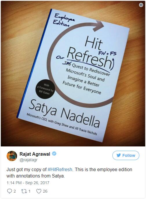 在《Hit Refresh》这本书中,纳德拉不仅披露发生在微软内部的复兴和转变,展望了即将影响我们生活的新技术(比如人工智能、混合现实、量子计算),顺带讲述了自己从印度到美国的奋斗历程。
