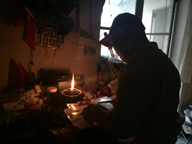 为了让自己和父亲近一点,在这套一个人居住的房中,他把床铺搬到了一间被用作父亲灵堂的屋里。阴天,光线很暗,屋里没有开灯,只有一个影影绰绰的蜡烛,供着父亲戴晖的遗像,以及生前的一切文件。进入房间,每个人的手机无缘由的失去了信号。