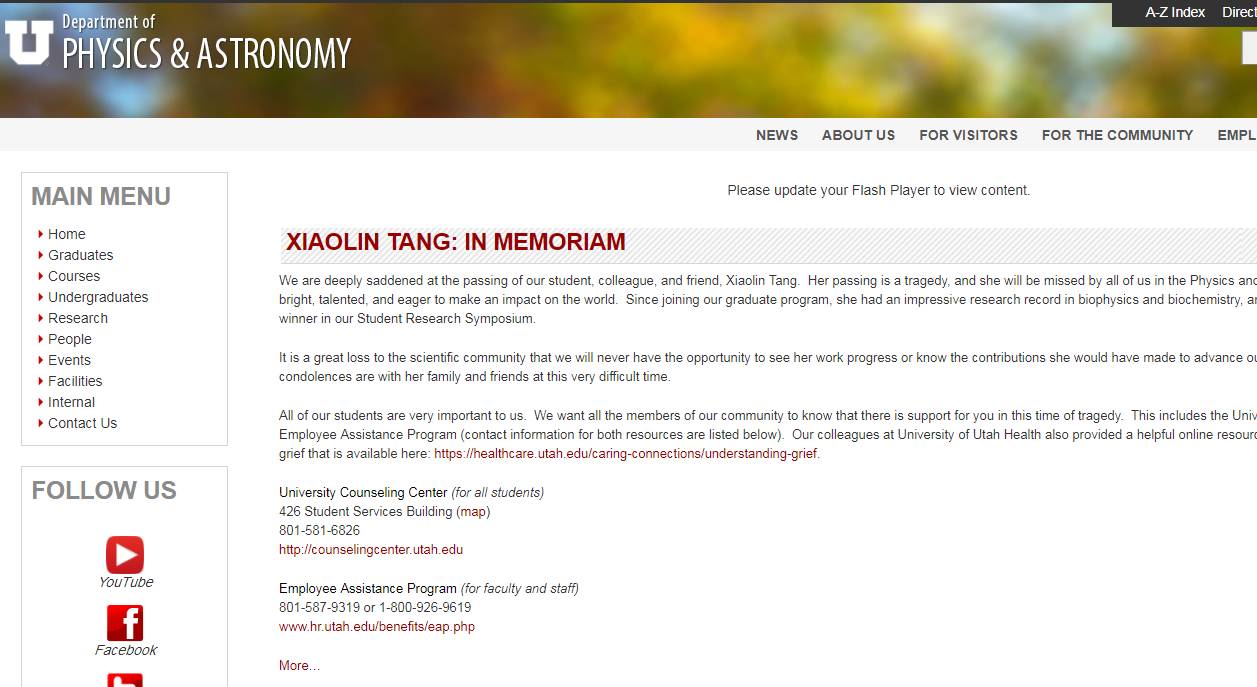 ▲犹他大学物理与天文学系官方网站上发布了对唐晓琳的悼念文章。网页截图