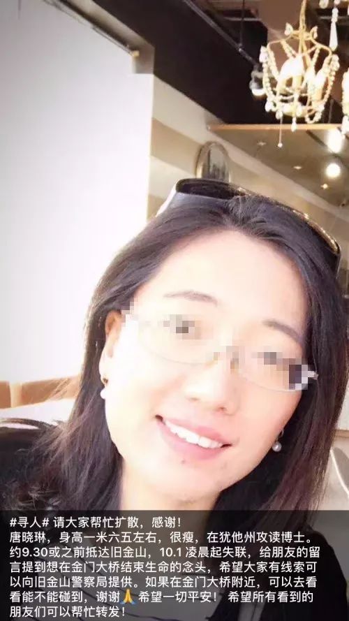 在唐晓琳失踪后,她朋友在社交媒体上发出的寻人消息显示,唐晓琳生前曾经透露,自己有在旧金山金门大桥结束生命的念头。