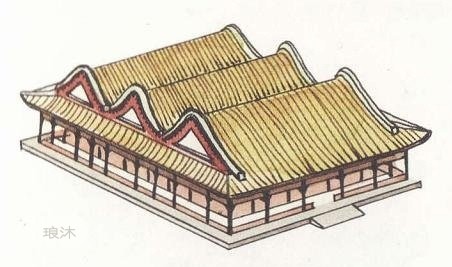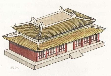 “庑殿”是清式说法,在此之前它又有“五脊殿”等名称。因为庑殿式屋顶上共有五条脊,即,一条正脊和四条垂脊,所以称为“五脊殿”。吴殿顶也是“庑殿顶”,是宋式叫法。四阿殿顶也就是“庑殿顶”。“四阿殿顶”也是宋式叫法。“阿”是建筑屋顶的曲檐,“四阿”就是四面坡式的曲檐屋顶。庑殿顶共有五条脊、四面坡,所以叫做“四阿殿顶”。