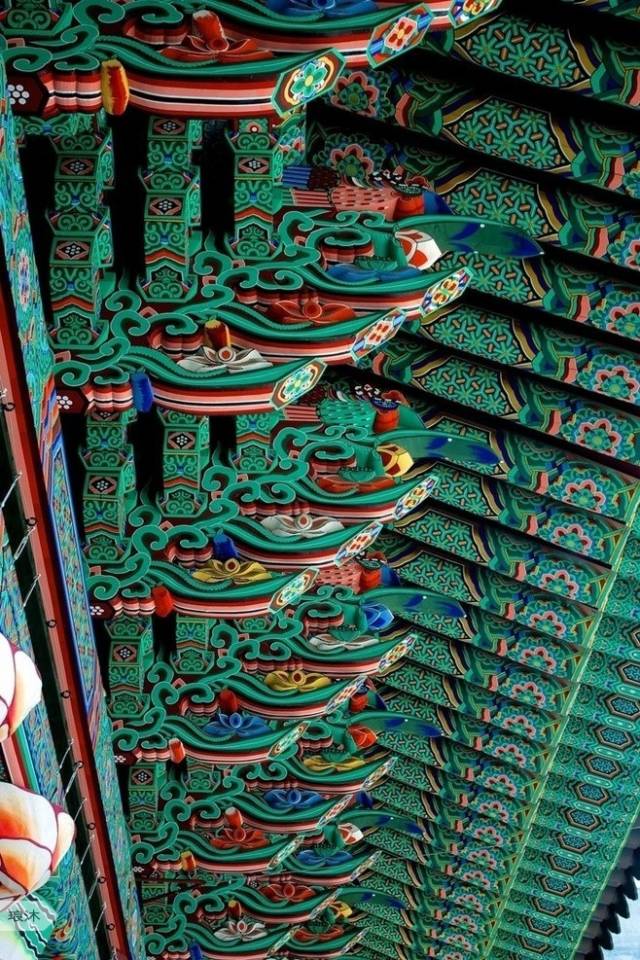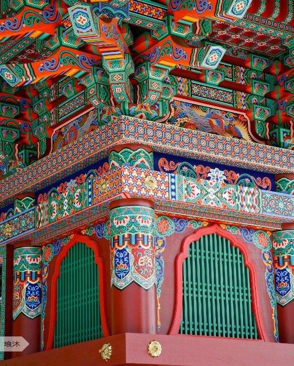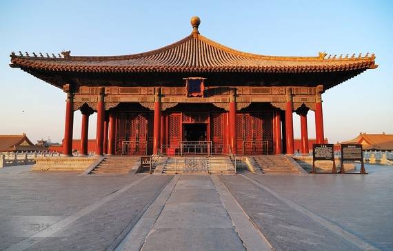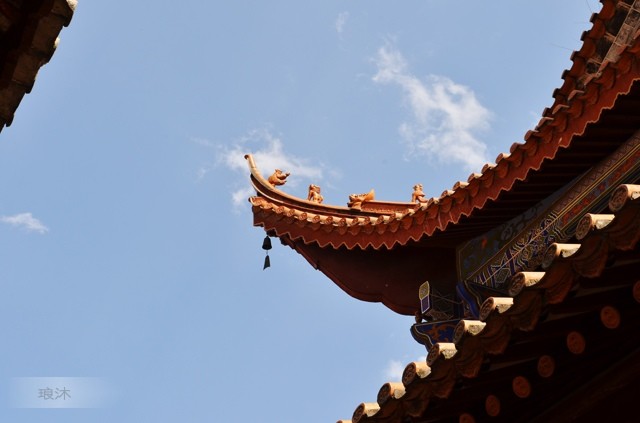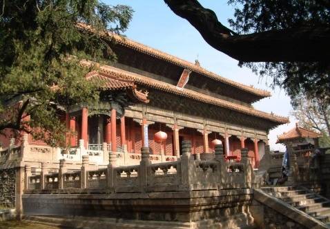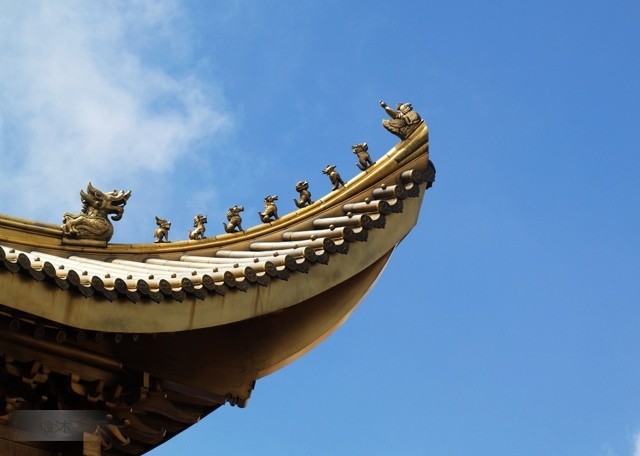 重檐庑殿顶庄重雄伟,是古建筑屋顶的最高等级,多用于皇宫或寺观的主殿,如故宫太和殿、泰安岱庙天贶殿、曲阜孔庙大成殿等。