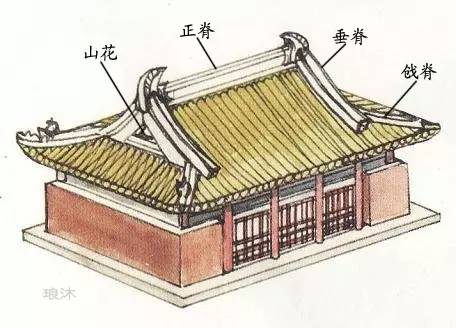 “歇山”是清式叫法,在清代之前它又有“曹殿”、“汉殿”、“厦两头造”等不同名称。又称九脊顶,有一条正脊、四条垂脊、四条戗脊。前后两坡为正坡,左右两坡为半坡,半坡以上的三角形区域为山花。