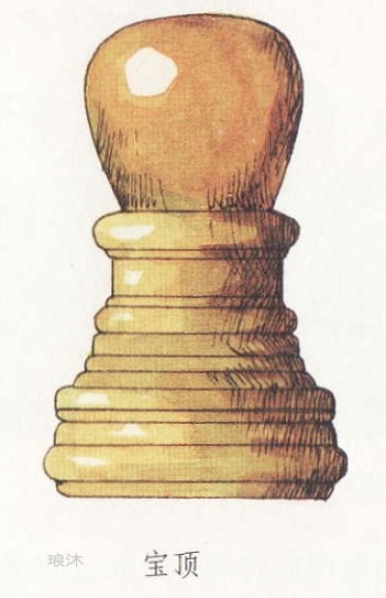 在建筑物的顶部中心位置,尤其是攒尖式屋顶的顶尖处,往往立有一个圆形或近似圆形之类的装饰,它被称为“宝顶”。在一些等级较高的建筑中,或者确切地说,在皇家建筑中,宝顶大多为铜质鎏金材料制成,光彩夺目。