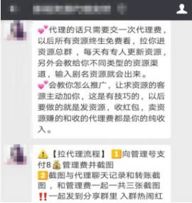 通过交谈,每日经济新闻(微信号:nbdnews)记者发现,在很多“资源售卖者”背后都有团队组织,即“发资源的团队”。记者购买“资源代理”后,被“上家”拉进了2个分别有近500人的微信群。其中一个即是资源库,在资源库中,只有管理员有发言权利,其他人只能拿剧不能说话,否则会被罚款。