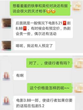 在询问国庆档影片以及热门网剧《白夜追凶》等相关资源后,对方称“首次无偿,后面一般情况下电影5.21元,热剧8.88元”。不过,对这些资源的具体价格,不同的售卖者的价格会稍微有些差别,但基本都在3~8元之间。