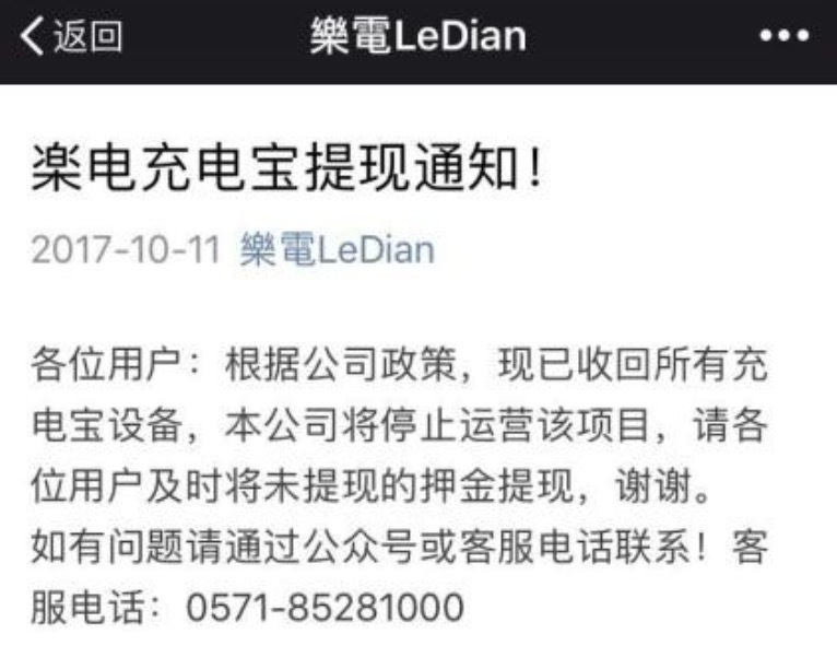 幸好这是一位有良知的共享创业者。十一长假后,乐电通过微信公众号发布消息,告知用户公司将停止运营,并已收回所有充电宝设备。并提醒用户“及时将未提现的押金提现”。不过,乐电对充电宝和机柜等如何进行善后,并未作出具体解释。