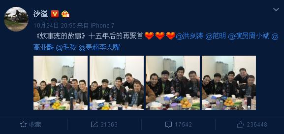 沙溢发了一条微博,说时隔十五年,《炊事班的故事》再聚首。照片里是一些熟悉的面孔,但是名字嘛要回忆回忆。