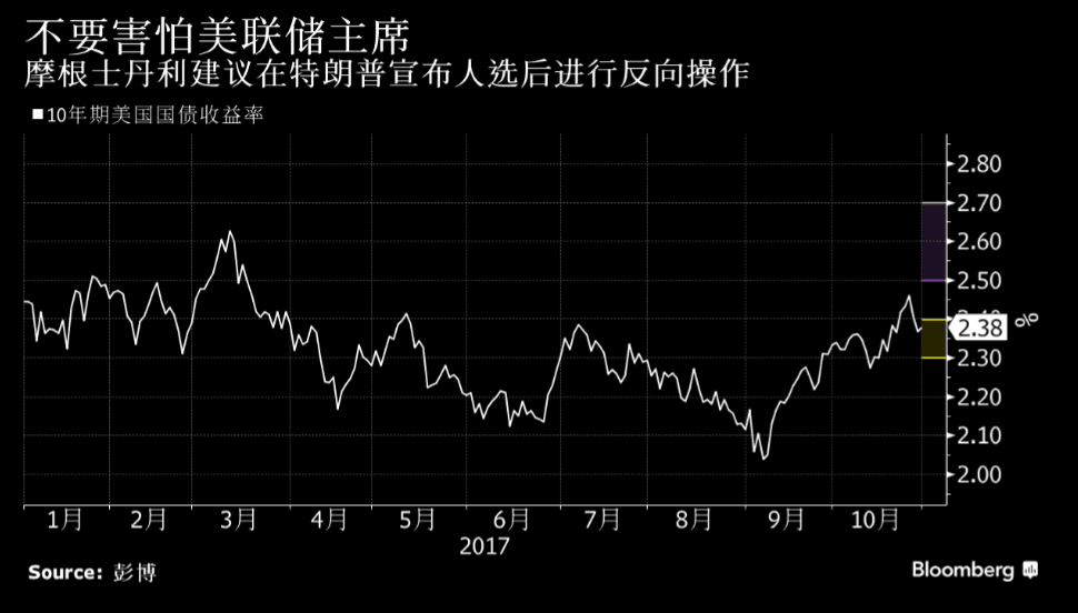 摩根士丹利预测,鲍威尔获得提名将推动美国国债上涨,10年期收益率在之后一周将在2.3%至2.4%之间波动。根据Hornbach的预测,若泰勒获得提名,美国国债的走势将恰好相反,收益率将上升至2.5%至2.7%。