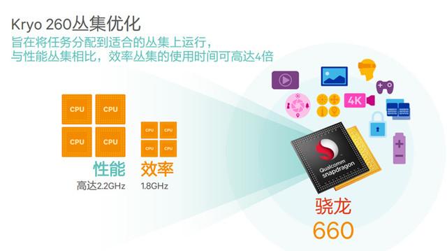 音频/视觉处理:骁龙660移动平台首次在骁龙600系列中采用了支持向量扩展(HVX)的Qualcomm Hexagon 680 DSP,可支持高性能低功耗的成像、计算机视觉和机器智能负载处理,将大量的影音处理任务交给DSP而非CPU,令手机功耗更低,并且令CPU有更多的发挥空间处理其他任务。优化的软件库可支持TensorFlow和Halide。